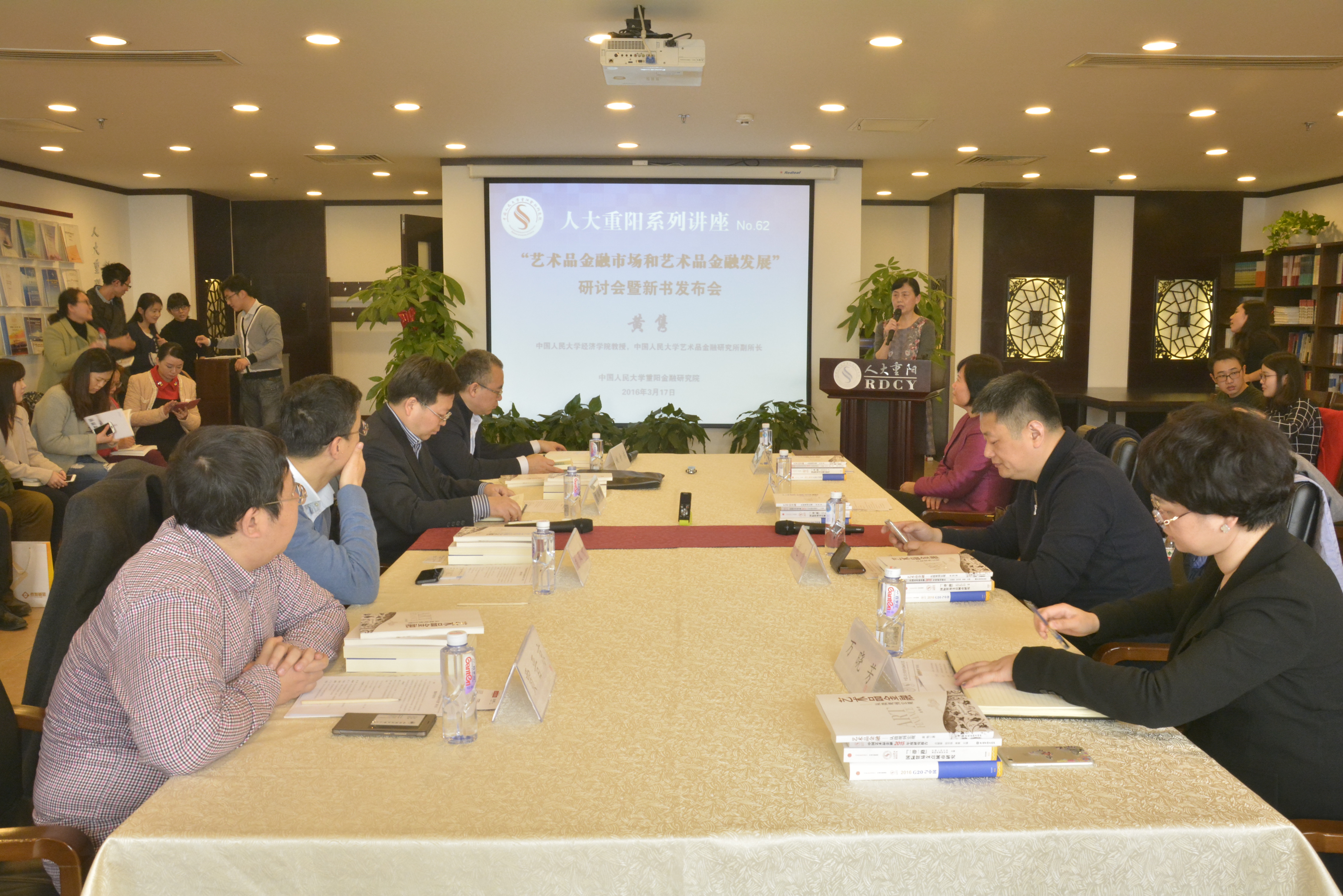 2016年3月17日下午,bet28365体育与中国人民大学重阳金融研究院在文化大厦602会议室共同举办“艺术品金融市场和艺术品金融学科发展”研讨会暨新书《中国艺术品金融2015年度研究报告》及《艺术品金融——从微观到宏观》发布会。中国金融出版社社长魏革军先生、中国人民银行金融研究所所长姚余栋先生、中央美术学院教授赵力先生、中央财经大学法学院副院长刘双舟教授、民生金融租赁股份有限公司总经理万晓芳女士、中国人民大学重阳金融研究院宏观研究部主任贾晋京先生、bet28365体育副所长黄隽教授作为主题演讲嘉宾参加了研讨。中国人民大学重阳金融研究院信息中心总编辑胡海滨女士主持了会议。