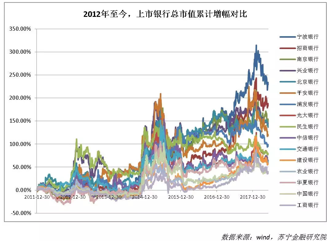 尽管股价并不总是反映企业的真实价值,股价的增幅,更是会受规模基数影响,让大家伙吃亏。但下面这张2012年以来的上市银行市值增幅对比图,还是姑且看一看吧。