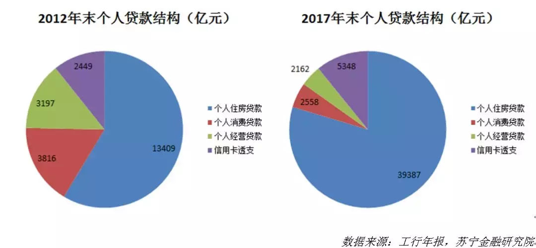 不过,与大家印象里的消费金融大趋势不同,工行的零售转型,抓的却是购房贷款的大风口。2012-2017年,工行个人住房贷款从1.34万亿元增长至3.94万亿元,在个人贷款中的占比由59%提升至80%,个人消费贷款和个人经营贷款,余额都是下降的。